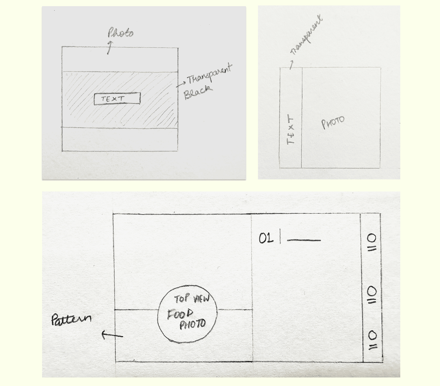 The final layout of the cookbook achieves a balance of aesthetics and functionality. By thoughtfully managing space, shapes, typography and visual flow, the design ensures a seamless and intuitive experience for the user. The top view images of dishes creates a uniformity throughout the publication. The plates cut in half showcase the food while still keeping typefaces in focus.